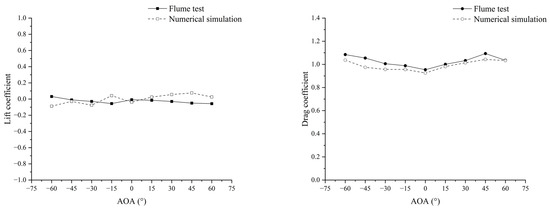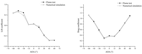 The CL and CD for the airfoil beam and cylindrical beam are presented in Figure 12 and Figure 13, reflecting data from the flume test and numerical simulation. The numerical simulation results exhibited a consistent trend when compared with the results from the flume test.