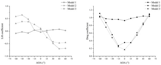 The relationship between the hydrodynamic coefficients of beams with different shapes and the angles of attack are depicted in Figure 14 (Model 1: cylindrical beam, Model 2: airfoil beam, and Model 3: elliptical beam). Overall, the CD of the beams exhibited an increasing trend with the absolute value of the increasing AOA. However, the variation in AOA has minimal impact on the CD of the cylindrical beam. The cylindrical beam’s drag coefficient was on average 49.54% higher than that of the airfoil beam and 59.74% higher than that of the elliptical beam. The trend in drag coefficient changes for the elliptical beam resembled that of the airfoil beam. As the absolute value of the AOA increased, the CD of the elliptical and airfoil beams reached their respective maximum values of 1.098 and 1.111 at AOAs of 60° and −60°, similar to the CD of the cylindrical beam. Notably, the CD of the airfoil beam reached its minimum value of 0.274 at an AOA of −15°, while the CD of the elliptical beam reached its minimum value of 0.167 at an AOA of 0. For an AOA less than 0°, the CD of the elliptical beam was slightly lower than that of the airfoil beam, while for angles greater than 0°, the CD of the elliptical beam was slightly higher than that of the airfoil beam.