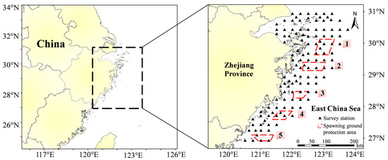 The data were collected during the spring (April) of 2015–2022 from the bottom-trawl survey of fishery resources in the Zhejiang’s offshore area (surveyed sea aea was 27°00′ N–31°00′ N, 120°50′ E–123°75′ E). Along the protected coastline and S. japonica spawning grounds (Notice of the Zhejiang Provincial Oceanic and Fishery Administration on the Establishment of the Spawning Ground Protection Areas of the Major Economic Fishes in Zhejiang Offshore, Zhehai Yuzheng (2017] No. 16, https://www.zj.gov.cn, accessed on 1 December 2023), a site was set up every 0.5°, for a total of 120 sites, and the site survey method was used for sampling in the different years (Figure 1).