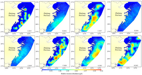 The annual variation in S. japonica resources was obvious, and the overall resources fluctuated and increased. Among them, the relative resource abundance fluctuated greatly from 2015 to 2019, and the resources were relatively stable from 2020 to 2022. From 2015 to 2022, the spatial distribution pattern of S. japonica was roughly the same, which was concentrated in the central and south-central islands and reefs in the study area (Figure 2).