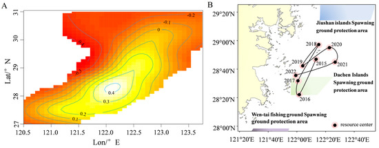 From 2015 to 2022, the distribution range of the resource center of S. japonica was 122°00′ E–122°30′ E and 28°20′ N–29°00′ N, mainly located near the waters of the Jiushan Islands protected spawning ground area and Dachen Islands protected spawning ground area in the central part of the Zhejiang’s offshore area. From the perspective of the spatial change trajectory of the resource center: in 2015–2016, the resource center of S. japonica shifted to the southwest; in 2017–2018, the resource center shifted to the northeast; the change pattern in 2019 was consistent with that in 2016; and in 2020–2022, the resource center shifted in the southwest offshore direction (Figure 3).