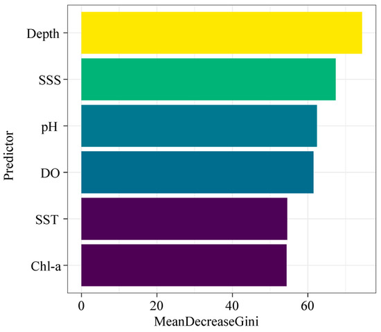 The importance of the environmental factors regarding the distribution of S. japonica was ranked using the RF output (Figure 4). MDG represents the heterogeneous effects of the observed values of the nodes on the classification trees and environmental factors. Its value represents and is proportional to the importance of the explanatory variables. It is therefore an important indicator for determining the importance of each factor. The environmental factors affecting the distribution of S. japonica distribution were ranked as Depth, SSS, pH, DO, SST, and Chl-a from first to last. The model’s accuracy, precision, recall, and F1 score were calculated using the data from the confusion matrix (Table 3). The mean accuracy value of 0.74 indicated a high proportion of correct model tests, and the mean precision value of 0.78 was also noteworthy. The mean recall of 0.90 showed that the model could correctly identify most positive samples. The results indicated that the model’s accuracy improved when testing for the presence of S. japonica. The mean F1 score of 0.83 indicated that the model achieved a good balance between accuracy and recall (Table 3). The random forest model performed well in this test.