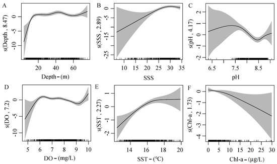 GAM-derived Effects of environmental factors on the S. japonica, based on the model constructed using: (A) Depth, (B) SSS, (C) pH, (D) DO, (E) SST, and (F) Chl-a. The plot includes a spline function (s) and the corresponding edf value. The shaded area represents the point-by-point standard deviation of the fit function, which indicates the upper and lower bounds of the 95% confidence interval.