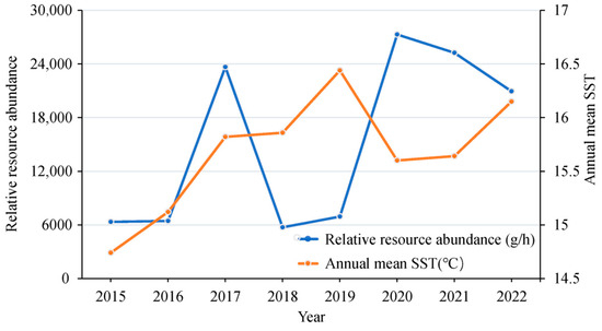 For marine life, global climate change is mainly reflected in changes in sea surface temperatures. The results showed that the mean sea surface temperature in the spring of 2015 to 2022 was increasing. According to the results of the analysis of the trend, the relative resource abundance of S. japonica increased with slight increases in sea surface temperature. As the surface water temperature continued to rise, the amount of the resource showed a downward trend (Figure 7). A small increase in temperature was found to have some stimulating effect on the resources of Octopus ocellatus by Cui et al. [19]. However, if the temperature rises too high, it can have an adverse effect on O. ocellatus resources, indicating that cephalopods are sensitive to environmental changes. The ocean warming model driven by climate in China is parallel to and is exceeding the trend of the rising global average temperature. Different species or different life stages of a species have different heat tolerance limits. Although warmer water temperatures may be beneficial to the growth and reproduction of some species, cephalopod responses to climate change can be extremely complex [20]. Changes in ocean temperature may lead to earlier life cycle events such as cephalopod migration, maturation, and reproduction. At the same time, changes in ocean temperature may affect population flow and abundance by changing the type and amount of the food eaten by cephalopods and the characteristics of their spawning habitats [21,22,23]. As an annual cephalopod, climate change may have profound effects on the species’ biological, physiological, and behavioral changes, which can further impact its distribution.