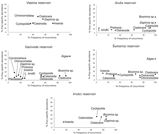 Costello graph. Prey-specific abundance versus frequency of occurrence of the diet of roach collected in five reservoirs in Serbia.