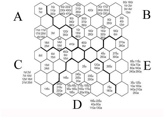 The 142 digestive tracts of roach associated with 56 (7 × 8) SOM output neurons, arranged in five clusters (A, B, C, D and E). The code for each digestive tract consists of the ordinal number of the specimen and two letters for the reservoir studied (Gr—Gruža Reservoir, Šu—Šumarice Reservoir, Ga—Gazivode Reservoir, Vl—Vlasina Reservoir, Vr—Vrutci Reservoir).
