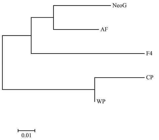 The genetic distance between the CP and WP populations was the closest (Da = 0.0060), and the genetic distance between the CP and F4 population was the farthest (Da = 0.1790), indicating that the genetic relationship between the CP and WP population was close, and the genetic difference between the CP and F4 population was large. In previous studies, researchers have also observed a similar phenomenon; that is, there are significant differences between wild populations and cultured populations, and the genetic distance between the two is far. The reason for this phenomenon can be attributed to the long-term domestication process of the breeding population. This process led to a moderate genetic differentiation between cultured and wild populations [,]. The results of the NJ phylogenetic tree, PcoA, and population genetic structure analysis showed that F4, NeoG, and AF were genetically similar, which was also in line with the theoretical results because the parents of the AF population were the F4 and NeoG populations, and theoretically, there should be a closer genetic relationship. There may be many reasons for this, such as limited and accidental sampling numbers and reproductive pressure caused by artificial propagation.