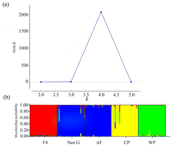 (a) Graph of the variation in Delta K with the value of K. (b) The genetic structuring of yellow drum populations according to the optimum value of K (K = 4). Different colours indicate different genetic clusters, and each individual is shown as a vertical line divided into segments representing the estimated membership proportion in the four ancestral genetic clusters. F4, parent population; Neo G, neo-male population; AF, all-female population; CP, common population; WP, wild population.