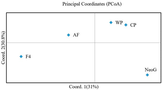 A Neighbor-Joining (NJ) tree was constructed based on the genetic distance among populations. The five populations were clustered into two branches, of which CP and WP were one branch; in the other branch, AF and NeoG were first clustered into one branch, and F4 was clustered into one branch (Figure 1). The Structure analysis tested K from 1 to 6. The optimal K value was determined to be 4 according to the maximum ΔK value (Figure 2a). According to the optimal K value, the five yellow drum populations could be divided into four clusters: cluster I contained the F4 population, cluster II contained the NeoG and AF populations, cluster III contained the CP population, and cluster IV contained the WP population (Figure 2b). The results of PCoA also reached a similar conclusion, in which three principal components explained 83.14% of the total molecular variation (Figure 3). The results of PCoA also showed that the WP and CP populations were clustered together and genetically distinct from the other three populations (F4, NeoG, AF).