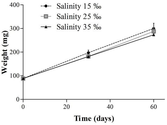 Weight of clownfish Amphiprion ocellaris reared in different salinities produced with artificial seawater. There were no significant differences (p = 0.11) for both.