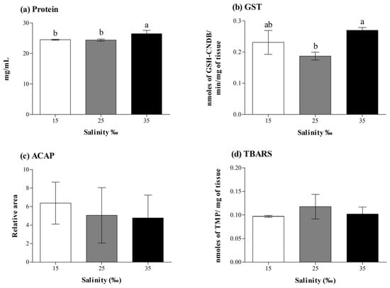 The effect of different salinities produced with artificial seawater on whole-body (a) protein content, (b) glutathione S-transferase activity (GST), (c) total antioxidant capacity against peroxyl radicals (ACAP), and (d) lipid peroxidation (TBARS) on juvenile clownfish Amphiprion ocellaris. Different letters indicate significant differences (p < 0.05).