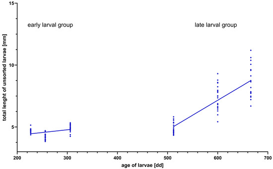 Total length (TL in mm) of pikeperch larval stages prior to the size separations (n = 20 per age stage) starting from 227 dd. Dots indicate the total length of single individuals. A linear regression line has been plotted within both developmental larval groups. The corresponding developmental groups for the expression analysis are added (early larval group: aged 227 to 306 dd, late larval group: aged 512 to 666 dd).