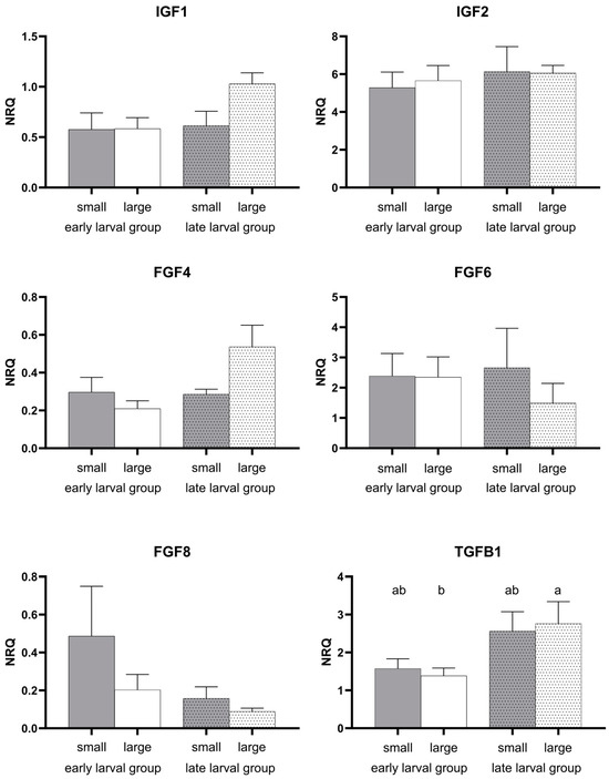 The expression levels of the insulin-like growth factor-encoding genes IGF1 and IGF2, as well as the fibroblast growth factor-encoding genes FGF4, FGF6, and FGF8, showed no significant differences across the samples (Figure 5). The expression of TGFB1 (Transforming growth factor beta 1) was significantly increased between the early large larval and late large larval samples (Figure 5).