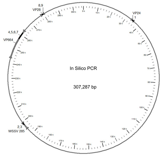 This study analyzed a variety of primers designed to detect WSSV to evaluate its performance in silico. As shown in Figure 1, these primers target the following regions of the WSSV genome: ORF WSV058 (encoding for the structural protein VP24), ORF WSV285 (according to sequence AF332093 from China), ORF WSSV419 (encoding for the protein VP664), and ORF WSSV480 (encoding for the structural protein VP28). Interestingly, even though it has been suggested that the putative function of the protein encoded by ORF285 might be similar to that of VP28 [], this still needs to be confirmed.