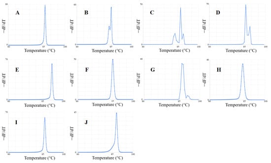 Predicted melt curves of the PCR products amplified with the primers analyzed in the current study. The plots were generated using uMelt under default parameters. (F): []; (G): []; (J): []; (D): []; (B): []; (H): []; (E): []; (I): []; (A): [], and (C): [].