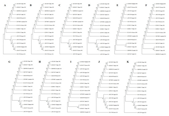 Phylogenetic trees of the sequences amplified by the different sets of primers analyzed in the current study. The percentage of replicate trees in which the associated taxa clustered together in the bootstrap test (1000 replicates) are shown next to the branches. (J): [] (WSSV1011F–WSSV1079R); (A): [] (146F1–146R1); (B): [] (146F2–146R2); (H): [] (VP28-140Fw–VP28-140Rv); (E): [] (P1–P2); (F): [] (P3–P4); (I): [] (WSSV341F–WSSV341R); (K): [] (WSSV-RT1–WSSVRT2); (C): [] (FQ-P3–FQ-P4); (D): [] (Fw–Rv); and (G): [] (RT-WSSV-F154–RT-WSSV-R154).