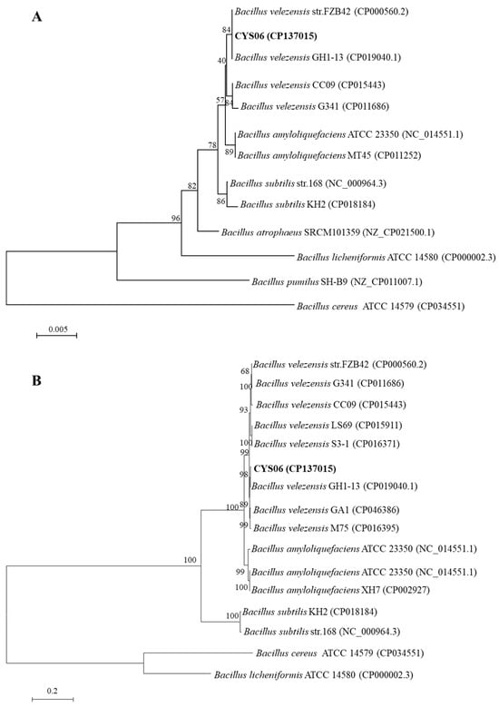 A total of 112 strains were isolated from the grass carp intestines, and 9 of them show an antagonistic activity against indicator GYK1. Among these strains, CYS06 exhibits the strongest antibacterial activity, as well as non-hemolytic activity. The strain CYS06 16S rRNA gene sequence showed the highest similarity to that of the B. velezensis strain GH1-13 (GenBank accession no. CP019040.1), with 100% similarity. Moreover, the gyrA gene sequence was found to share 99.50% similarity with strain GH1-13. The phylogenetic tree based on the 16S rRNA gene showed that strain CYS06 clustered with B. velezensis strains GH1-13, str.FZB42, CC09, and G341 (Figure 1A). The phylogenetic tree based on the gyrA gene showed that strain CYS06 clustered with B. velezensis (Figure 1B). These results suggested that strain CYS06 belongs to B. velezensis.