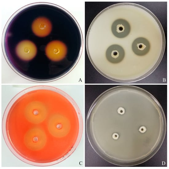 The hydrolysis activities of starch (A), casein (B), cellulose (C), and fat (D) from the strain CYS06.