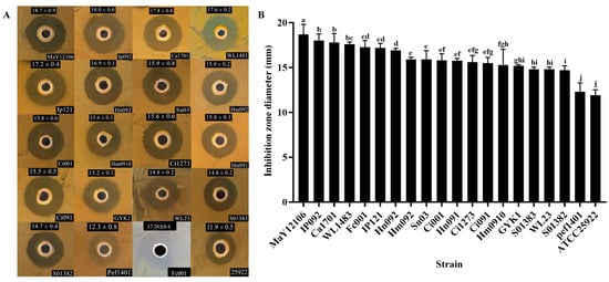 Antagonistic activity of the strain CYS06 against fish pathogens. (A) Antagonistic activities of the strain CYS06 against various fish pathogens. (B) Comparative analysis of the antagonistic effect. Different letters indicate a significant difference (p < 0.05).