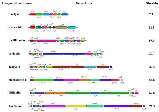 The antagonistic substance synthesis gene cluster of the strain CYS06 was analyzed online using antiSMASH v5.1.2 software (https://antismash.secondarymetabolites.org/#!/start (accessed on 11 May 2022)). Based on the results of the analysis, a schematic diagram of the antagonistic substance synthesis-related gene cluster in the strain CYS06 was constructed. Based on the predicted antagonistic substance synthesis-related gene sequences, the proportion of the antagonistic substance gene cluster in relation to the total length of the genome sequence was analyzed.