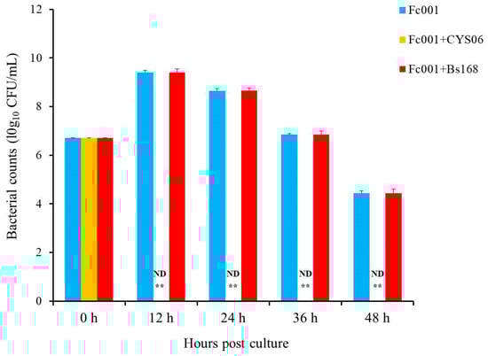 Compared with B. subtilis Bs168, B. velezensis CYS06 could significantly inhibit the growth of strain Fc001. No viable Fc001 was detected within 12 h when the CYS06 and Fc001 strains were co-cultured, indicating that strain CYS06 could inhibit the growth of strain Fc001 and kill it in a relatively short time (Figure 5). For the strain Bs168 without antagonistic activity, the Fc001 grew rapidly in the early stage (within 24 h), and approximately 104 CFU/mL of Fc001 were detected at the end of the experiment. The growth rate of strain Fc001 was not significantly inhibited by hte Bs168 strain, but was inhibited by the CYS06 strain, indicating that strain CYS06 is a potential biocontrol agent for the control of F. columnare.