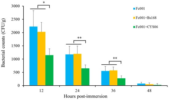 Immersion experiment: A total of 180 healthy grass carp (average weight: 14.78 g per fish) were randomly divided into three groups, with three tanks per group and 20 fish per tank (100 L of water). Strain Fc001, at the final concentrations of 5 × 106 CFU/mL, respectively, was added to the tanks in experiment group 1. Strains Fc001 and CYS06, at the final concentrations of 5 × 106 CFU/mL, respectively, were added to the tanks in experiment group 2. Strains Fc001 and Bs168 (as the positive control strain), at the final concentrations of 5 × 106 CFU/mL, respectively, were added to the tanks in experiment group 3. The water temperature was 28 ± 1 °C during the experiment. The gill tissues (three fish per tank) of fish in the three groups were collected. Then, the gill tissues were homogenized, and streaked onto Shieh agar plates, and the colonies of viable bacterial cell were counted at 12 h, 24 h, 36 h, and 48 h post-immersion, respectively.