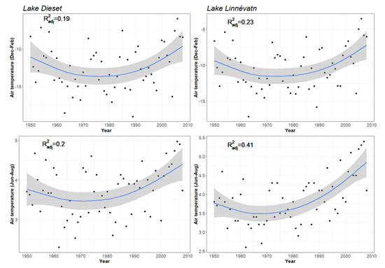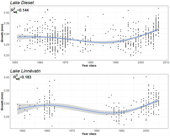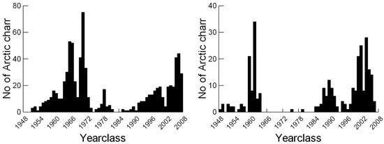 - Kristensen, D.M.; Jørgensen, T.R.; Larsen, R.K.; Forchhammer, M.C.; Christoffersen, K.S. Inter-Annual Growth of Arctic Charr (Salvelinus alpinus L.) in Relation to Climate Variation. BMC Ecol. 2006, 6, 10. [Google Scholar] [CrossRef] [PubMed][Green Version]