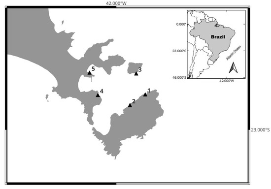 The study sites are located within the Marine Extractive Reserve of Arraial do Cabo (Figure 1), which was established in 1997, in the state of Rio de Janeiro, Brazil (22°57′57″ S, 42°01′40″ W). This Extractive Reserve consists of a partially protected area where only local fishermen are allowed to exploit resources. However, no-take zones are absent in this reserve and enforcement is poorly employed, with different sorts of fishing gear being used, including spearfishing [25]. Local reefs consist of shallow granitic rocky shores with depths reaching a maximum of 12 m. Benthic cover is dominated by epilithic algae and zoanthids, with sponges and a few massive and branching coral species [37,38,39]. The region lacks significant freshwater inputs, with low precipitation (<850 mm year−1, [40]) resulting in good visibility (~8 m) throughout most of the year.