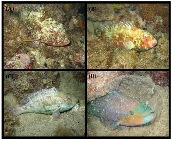 Examples of the four most abundant parrotfish species during inactivity: (A) Sparisoma axillare (initial phase); (B) Sparisoma frondosum (terminal phase); (C) Sparisoma tuiupiranga (terminal phase); and (D) Scarus zelindae (terminal phase).