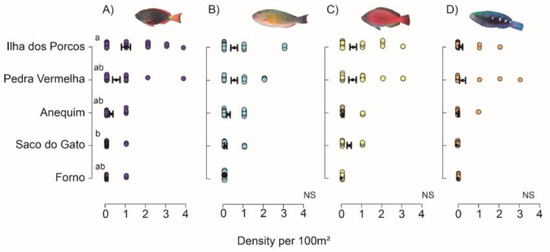Density (individuals / 100 m2) of the four most abundant parrotfish species on the studied sites: (A) Sparisoma frondosum; (B) Sparisoma axillare; (C) Sparisoma tuiupiranga and (D) Scarus zelindae. Color dots represent transect values, black dots are mean, bars indicate standard error and letters indicate homogeneous groups from Tukey’s HSD test.