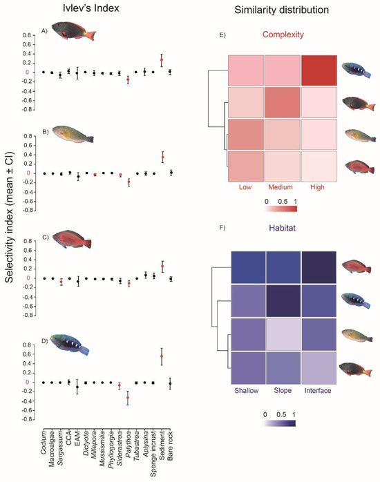 Sleeping substrate selectivity (Ivlev’s index) for (A) Sparisoma frondosum; (B) Sparisoma axillare; (C) Sparisoma tuiupiranga and (D) Scarus zelindae (Values are means ± 95% confidence interval (CI), red dots mean that CI did not cross zero value). Heatmap of the four most abundant parrotfishes in the study area representing the species distribution by (E) topographic complexity (low, medium and high) and distribution by (F) habitat (shallow, slope and interface).