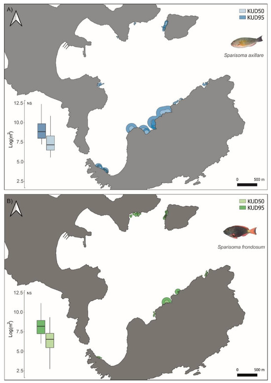 Sleeping site area and sleeping hotspots of (A) 23 Sparisoma axillare and (B) 18 Sparisoma frondosum, tracked with active acoustic telemetry in Arraial do Cabo. Darker colors represent 95% kernel utilization distributions (KUDs) (sleeping site area) and lighter colors represent 50% KUDs (sleeping hotspots). Non-significant values (NS) are shown between respective KUD values and between species. Data were log-transformed for better visualization.