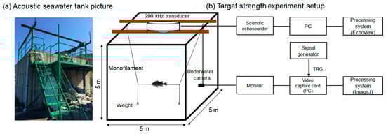 Photographs of (a) the seawater acoustic tank used to measure fish-specific TS and (b) an illustration of the experimental setup.