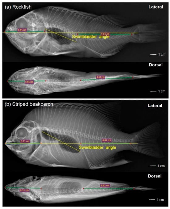 An example of ventral and dorsal X-ray images of (a) rockfish (TL = 25.5 cm) and (b) striped beakperch (FL = 25.3 cm). The yellow dotted line indicates the tilt angle () of the swim bladder from the centerline between the anterior and posterior margins according to the fish body.
