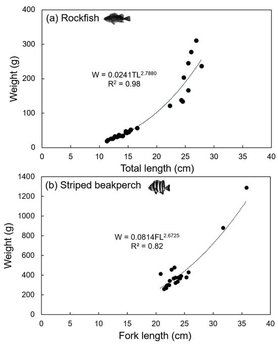 The relationship between length and weight for rockfish (a) and striped beakperch (b). The length of the rockfish represents the total length, and the length of the striped beakperch represents the fork length.