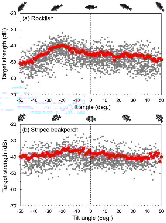 TS (gray circles) and average TS (red circles) as function of tilt angle for rockfish (a) and striped beakperch (b).