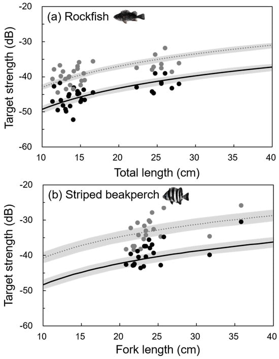 The relationship between the maximum TS and the average TS and length for rockfish (a) and striped beakperch (b). The gray circles represent the maximum TS values, and the black circles represent the average TS. The lines represent TS = 20logL + b20. The gray dotted line indicates the least-squares regression of the maximum TS, and the black solid line indicates the least-squares regression of the average TS, whereas the gray shaded areas represent the 95% Confidence Interval.