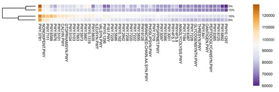 Figure 3. Top 50 most abundant predicted metabolic pathways annotated by PICRUST2. Values represent the averaged abundance of the samples triplicate. Pathway abbreviation can be found in the Supplementary Material.