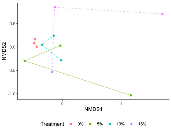 Figure 4. Non-metric multidimensional scaling (NMDS) analysis of gut microbiota of tilapia fry. None of the values presented a significant difference per treatment (p > 0.05).