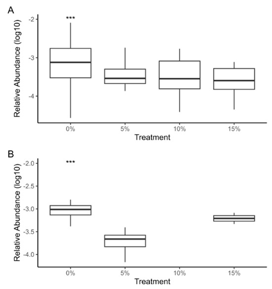 Cetobacterium, Aeromonas, Mycobacterium, and Gemmobacter are considered part of the core microbiota of tilapia fish [42,43,44]. Remarkably, Cetobacterium is thought to play a key role in tilapia gut. Although the exact function is unclear, its potential for macromolecules biosynthesis insights into a nutrition-related role [45,46,47]. Aeromonas is common in freshwater fish, however, some species represent opportunistic pathogens in tilapia [25]. Moreover, literature is consistent with the presence of Pseudomonas in microbiota of tilapia, in lesser abundance [48]. Interestingly, Ralstonia presented a higher abundance in 10% and 15% inclusion samples. Some studies have proposed that this genus is related to the cycling of nitrogen [49]. As mentioned above, 10% and 15% supplementation treatments presented a higher protein content, possibly indicating these fish to invest more energy in their excretions. Hence, increased Ralstonia abundance might be related to the metabolism of nitrogenous compounds on diets with higher microalgae content.