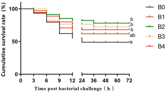 The cumulative survival rates of M. nipponense over a 72 h period are depicted in Figure 2 prawn mortality was primarily observed within the first 12 h, with only isolated individual deaths occurring after 24 h, specifically in groups B2 and B3. The descending order of survival rates for each group was as follows: B2 (79%), B3 (76%), B4 (69%), B1 (63%), and B0 (49%). Notably, groups B2, B3, and B4 exhibited higher survival rates compared to group B0 (p < 0.05).