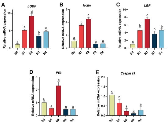 Effect of β-1,3-glucan on mRNA expression of immune-related genes in the hepatopancreas of juvenile oriental river prawns (M. nipponense) fed diets supplemented with different concentrations of β-1,3-glucan for eight weeks. (A) lipopolysaccharide and β-1,3-glucan binding protein (LGBP), (B) lectin, (C) lipopolysaccharide-binding protein (LBP), (D) tumor suppressor protein p53 (p53), (E) cysteine-aspartic acid protease 3 (caspase 3). Values are means ± SD for three replicates for each treatment. Bars with different superscript letters are statistically significant (p < 0.05).