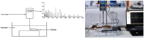 The force gauge method described in previous studies was adopted for the measurement of scallop shell closure force [,]. The devices for the experiment consisted of a stand, a digital force gauge (Nscing SH-III-100N, Suce, Nanjing, Jiangsu, China), and a water tank (Figure 2). A scallop was placed in the water tank, with the lower valve fixed on the experimental table and the upper valve opening and closing freely. The force gauge was installed on the stand, one end of which had a hooked rod fastened between the lower and upper valves, allowing for precise capture when the scallop closed its valve every time. Additionally, a data port was equipped on the other end, which was connected to a personal computer through a USB port.