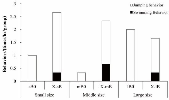 Video recordings showed that it was difficult for crabs to prey on scallops and that scallops avoided crabs through continuous closed-shell behavior or movement behavior. In the crab–scallop experiment, the number of jumping and swimming behaviors of each scallop increased significantly in the presence of the crab. These behaviors differed among scallop sizes, as the number of jumps was greater than the number of swims in medium- and large-sized scallops. The number of swimming episodes of scallops of all sizes in the experimental groups stimulated by the presence of crabs was significantly greater than that of the control group (p < 0.05). Additionally, the number of movement behaviors of small- and medium-sized scallops in the experimental group was significantly higher than that of the control group, but there was little difference in this measurement for large-sized scallops in the treatment and control groups (Figure 3).