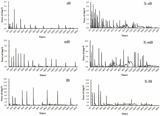 Typical force recording during a movement response for different sizes of M. yessoensis. sB, mB, and lB indicate small, medium, and large scallops in the control group, respectively; X-sB, X-mB, and X-lB indicate small, medium, and large scallops in the crab-stimulated group, respectively.