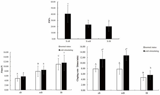 Maximum contraction force and clap rate of adductor muscles of M. yessoensis of varying sizes with and without exposure to the crab predator. Significant differences (p < 0.05) among different size groups without the presence of the predator were indicated by diverse uppercase letters. Significant differences (p < 0.05) amid various size groups during crab stimulation were described by different lowercase letters. * signifies a difference of significance (p < 0.05) between scallops of the same size with and without crab stimulation.