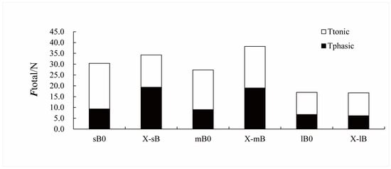 Figure 6 shows the Ftotal, Fphasic, and Ftonic data. Overall, the Ftonic was larger than Fphasic in the control group for all scallop size classes, and the Ftonic in the control group was significantly different from that in the experimental group when the scallops were stimulated by the presence of the predator. According to the results of one-way ANOVA, the differences in Fphasic and Ftonic were not significant between scallops in small and medium sizes without crabs present, but the Fphasic and Ftonic values of these size groups decreased after exposure to the predator (p < 0.05). Fphasic and Ftonic of large-sized scallops were lower than those of small- and medium-sized scallops. The interaction of scallop size with the presence or absence of crabs was also detected to be significant (two-way ANOVA, p < 0.05). The absence or presence of crabs, in addition to size, also had significant effects (p < 0.05) on Ftonic and Ftotal, and an interaction effect was detected.