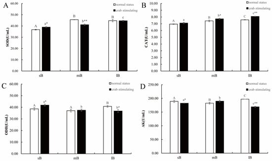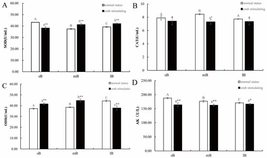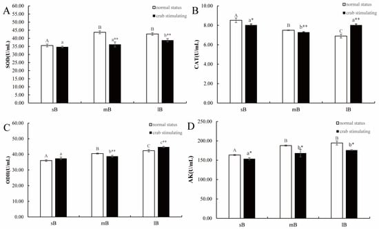 Contrast of enzyme viability in mantle tissue: (A) SOD, (B) CAT, (C) ODH, and (D) AK. Significant differences (p < 0.05) amid varying different size groups without the presence of the predator are presented with different uppercase letters. Significant differences (p < 0.05) among diverse size groups in the presence of crabs are expressed with various lowercase letters. “*” represents a difference of significance (p < 0.05) between identical sizes in varying stimulus states. “**” represents a difference of high significance (p < 0.01) between scallops of the same size with and without crab stimulation.