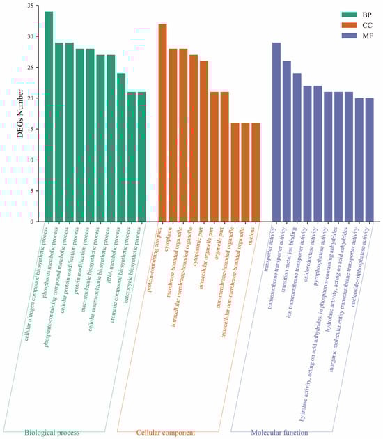On the basis of GO database analysis and functional enrichment classification of the 780 DEGs in the X-mBJ vs. mBJ comparison, 198, 98, and 331 DEGs corresponding to the biological process, cellular component category, and molecular function category were annotated. Figure 11 shows the 10 GO entries with the most DEGs enriched for each category. As for the biological process, the enrichment of DEGs was mainly found in the phosphorus metabolic process, cellular nitrogen compound biosynthetic process, and phosphate-containing compound metabolic process. DEGs associated with the cellular component category were mainly enriched in protein-containing complex, cytoplasm, and membrane-bounded organelle processes. Regarding the molecular function category, the enrichment of DEGs occurred in the processes of transition metal ion binding, transporter activity, and transmembrane transporter activity. These results suggested changes in gene expression in scallops of different sizes to different degrees after exposure to predation.