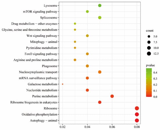 Being a comprehensive database, KEGG incorporates genomic, chemical, and systemic–functional information, so the biological functions of DEGs from scallops stimulated by crab could be further understood through KEGG analysis. A total of 159 DEGs presented enrichment in 86 KEGG pathways, and the top 20 enriched pathways are listed in Figure 12. Among them, ribosome, oxidative phosphorylation, autophagy-animal, purine metabolism, nucleocytoplasmic transport, and ribosome biogenesis in eukaryotes were the most significantly enriched.
